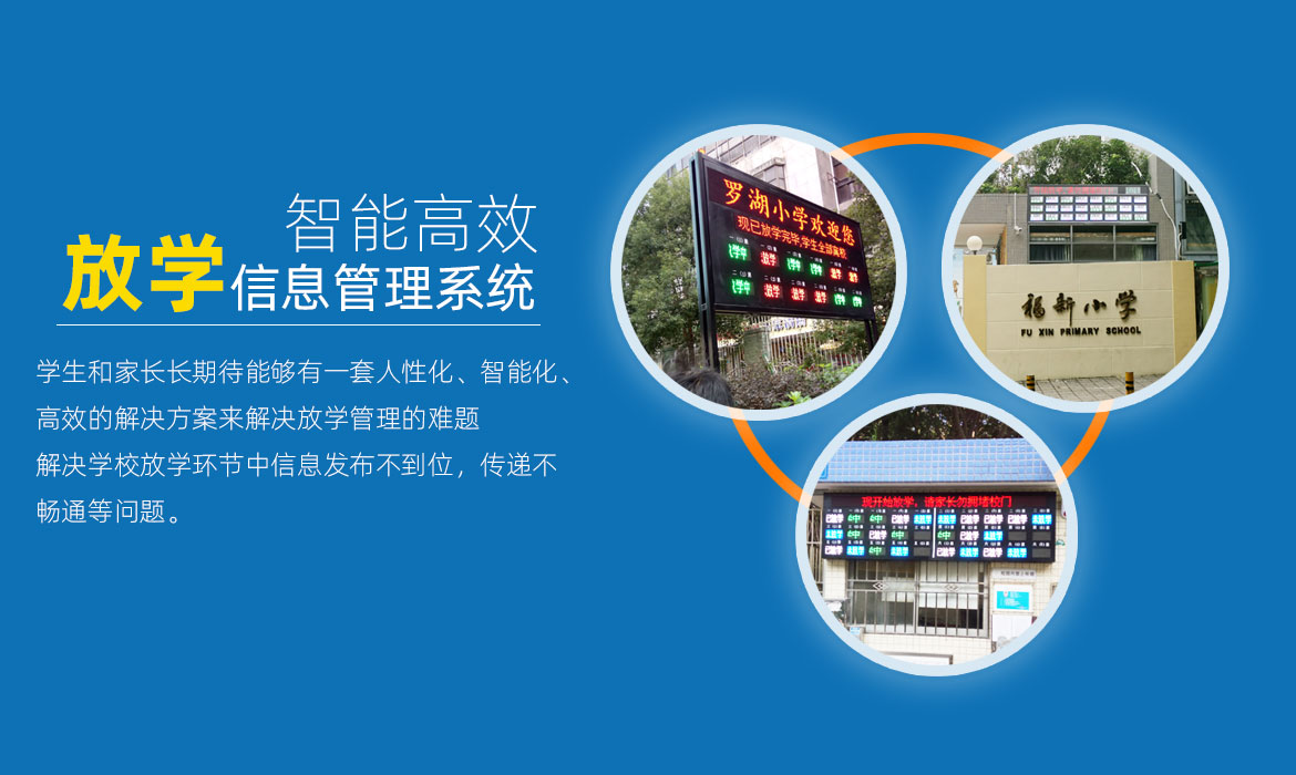 針對這種需求,我公司多方進行場景研究,推出了放學信息顯示系統來解決這個問題;該系統參考機場航站樓的航班到港顯示系統,在校門處安裝放學信息顯示系統,校方工作人員可以通過手持設備遙控設置顯示屏上每個班級的放學信息:未放學、正在放學、已放學三種即時狀態,也可發布即時通告,心中有底的家長可以心平氣和的選擇繼續等待還是到校門迎接孩子;