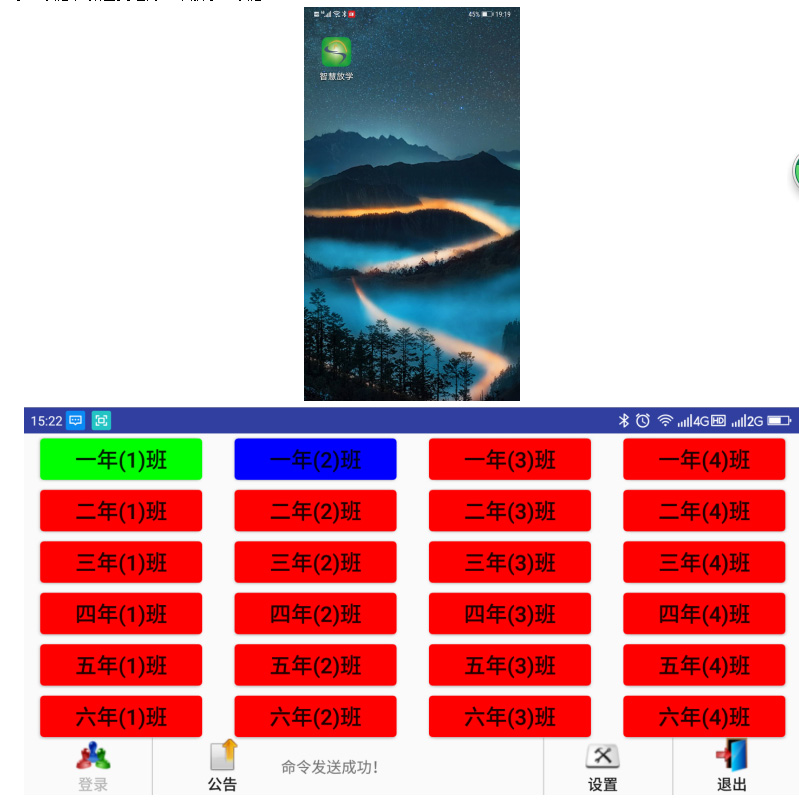 3.手持平板顯示界面(通過長按班級框,使其顏色變綠,LED大屏會顯示該班級為“正在放學”狀態,顏色變藍,為“已放學”狀態,顏色變紅為“未放學”狀態。)