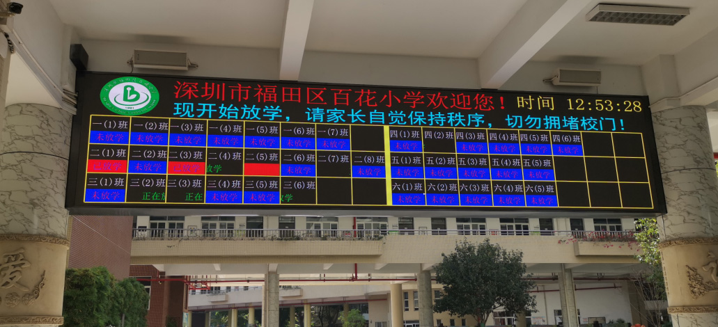 本系統把放學引導功能嵌入到學校原有LED顯示屏顯示功能中,使LED顯示屏功能更豐富、實用; 學校校門的LED顯示屏在其他時間可以象常規LED顯示屏一樣正常使用,當到放學時,系統自動定時進入放學引導功能狀態,通過系統配置的平板電腦,在無線的狀態下控制LED顯示屏上各個班級的放學狀態顯示,發布即時通告信息,系統還可通過顯示屏配備的戶外音箱同步播報即時班級放學狀態,使得校門的班級放學引導的效果更直觀明顯;通過手持平板電腦在界面點擊班級放學狀態,實時的同步更改LED大屏的班級放學狀態,操作簡單,使用快捷; 放學引導系統的LED顯示屏顯示版面設計為開放式的,可編輯顯示學校LOGO,當前時間,即時文字公告等,每個年級班級的顯示位置、顯示字體、顏色均可根據需要自由設定,確保突出學校特色; LED顯示屏作為放學引導系統使用時,必須滿足三個條件:一必須是全彩LED顯示屏、二是顯示屏控制系統必須是同步顯示屏控制系統、三是校門處必須有WIFI信號可接入校園網,具備以上條件,使用一臺手持平板電腦,通過本軟件系統即可把放學引導功能嵌入到LED顯示屏使用功能中。